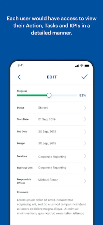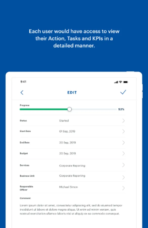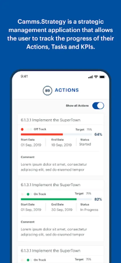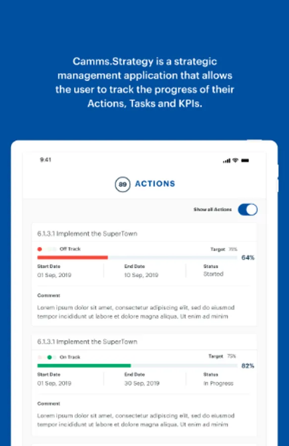 Camms.Strategy provides users with performance information at any level and it consolidates KPIs in a way that is easy to view and update. Also, it provides organisations with a corporate view of departmental and group performance using balanced scorecards, dashboards and traffic light views. The system also allows flexible reporting at various accountability points in a number of different formats. Camms.Strategy mobile application is designed to provide the users easy quick updates on their actions, tasks and KPIs on the go, also allowing them to view dashboards of progress and performance data.