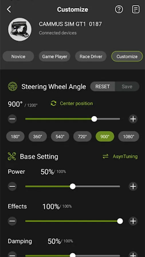 CAMMUS App is an application for controlling and debugging the racing simulator produced by CAMMUS, After the bound device is activated, Can search and connect devices via Bluetooth, After the connection, you can debug various parameters of the racing simulator, such as setting the steering Angle, Can also save the set parameters, After re-entering the application, the device can quickly write the saved parameter configurations.
