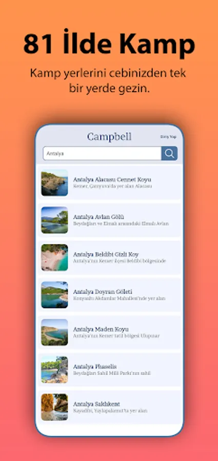With the application, it is to ensure that you reach it easily and without losing time. In short, it aims to carry the camp sites in all provinces in their pockets.