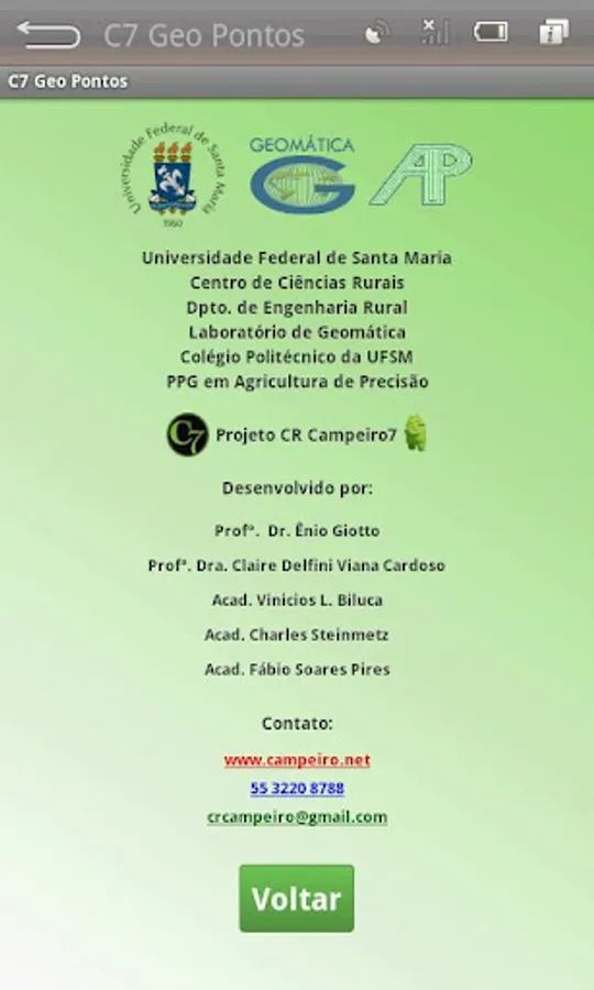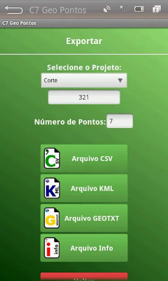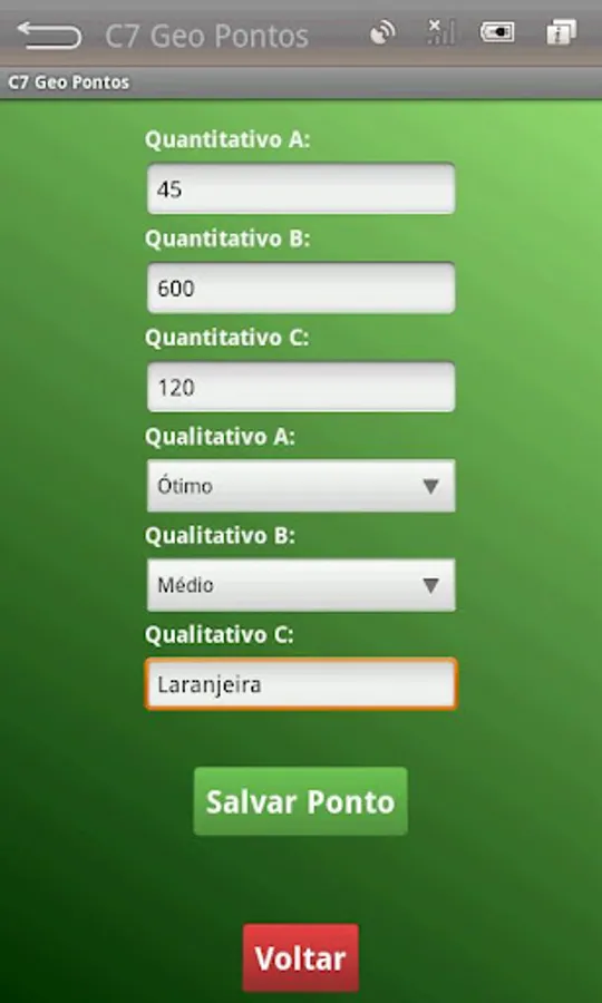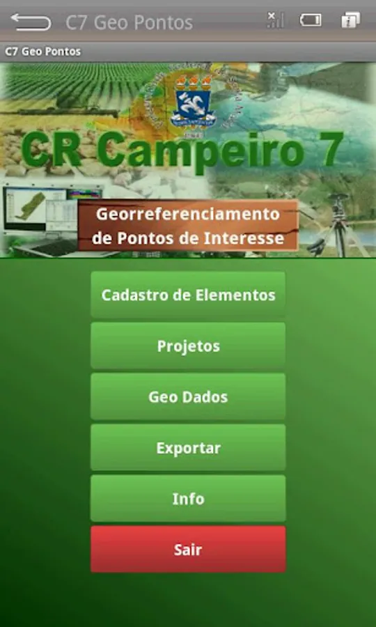 The Application C7 GeoPoints aims lifting of geographical coordinates of points isolated and its storage structure in a SQLite database in the identification of a project with the previous characterization of the elements. As the nature of the project the user can register elements (trees, poles, culverts, hydrants, etc.) that would be associated with the objectives of the survey data. Thus at each point georeferenced project beyond the identification of the element (point) can be informed three qualitative and three numerical attributes associated with the different points. The data of a project can be exported in CSV, KML and GeoTXT format files.