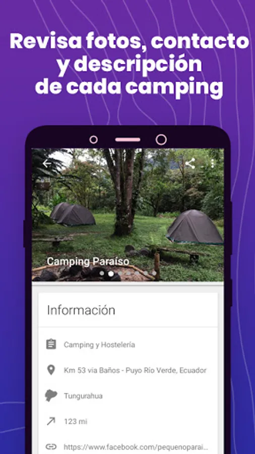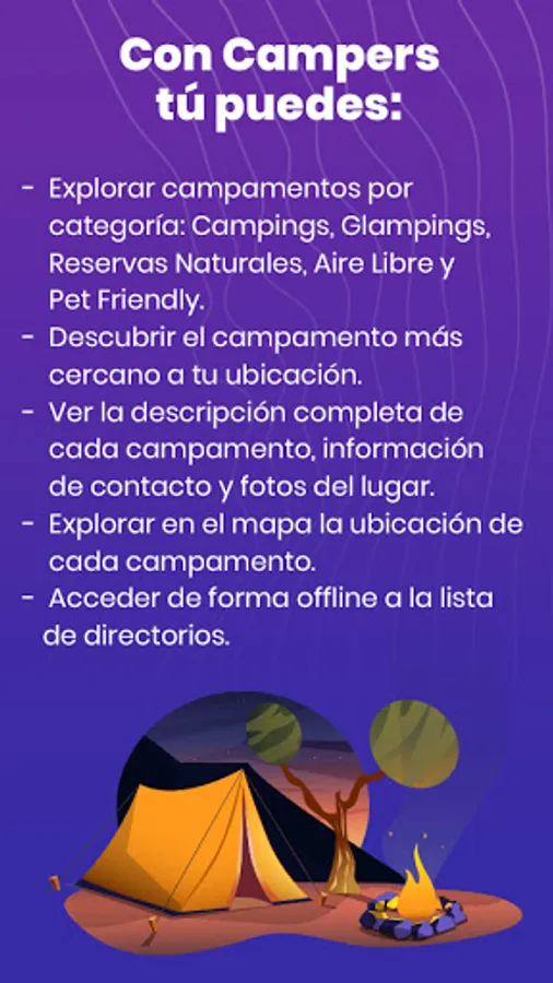 Campings, Glamping, Nature Reserves, Wild camping and more. Campers is the first application that includes all the camps in Ecuador in a single directory, easy and simple to explore.