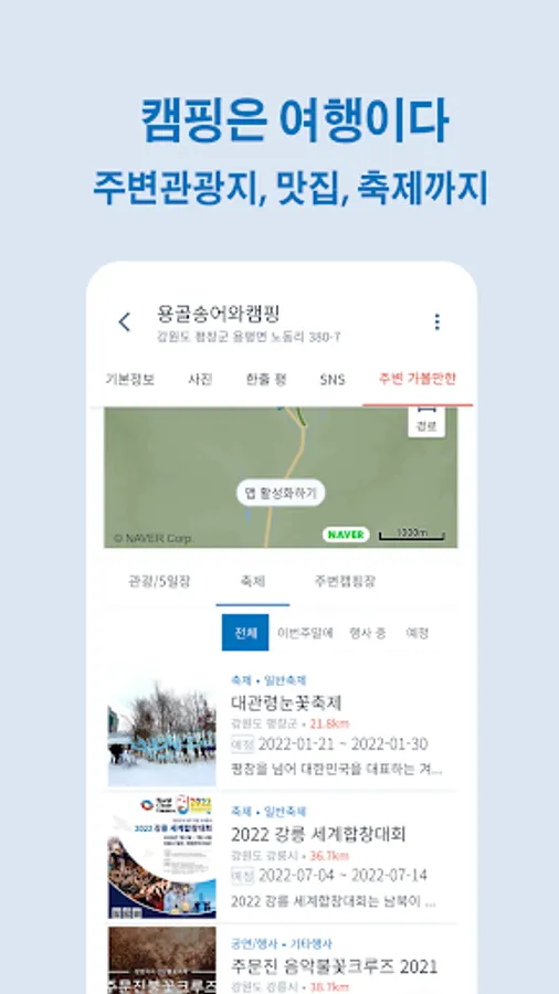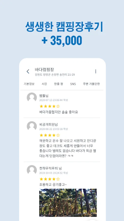 Camping Map allows you to choose a campsite with fun while looking at the real and vivid reviews of 500,000 camping map members as well as searching for all 3,500 campsites in Korea by condition. In addition, you can manage your own camping story while wishing for the campground you have been to and the campground you want to go to. Healing camping that will relieve you of a tiring week, leave now. Camping Map will do its best for beautiful camping on mobile following PC.