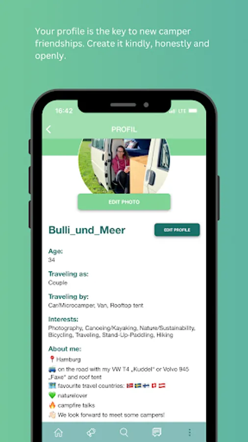 ...is the heart of the app. With this function you can find out which camping and vanlife enthusiasts are currently in your area and also want good company when travelling, a relaxed get-together around the campfire or joint activities.