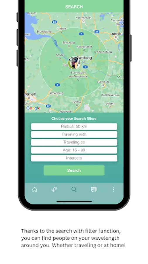 Choose in which radius you want to find like-minded people. You can use the various filters to refine the search results. For example, are you looking for someone to go hiking with you? Then tick “Hiking” in the “Interests” filter.