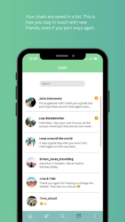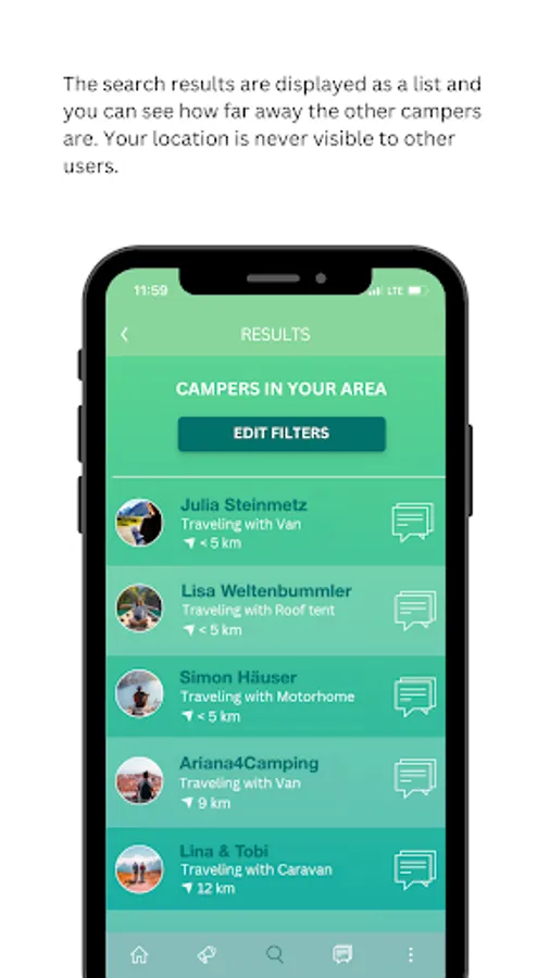 - Are you unsure whether your camping neighbor would like company or do you find it difficult to reach out to other campers personally? Then simply use the app to see who is also registered in your area and contact them via chat message.