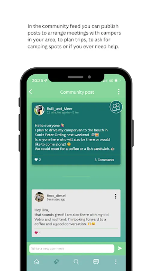 Here you can publish posts, for example if you want to connect with campers in your area, if you need help, are looking for a travel buddy or want to exchange information about camping spots. Of course you can also comment and like posts from other campers.