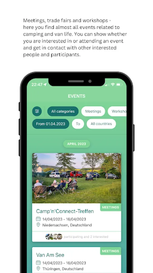 Meetings, trade fairs and workshops - in the app you will now find almost all events related to camping and van life. You can show at each event whether you are interested or will take part and get in contact with other interested people and participants.