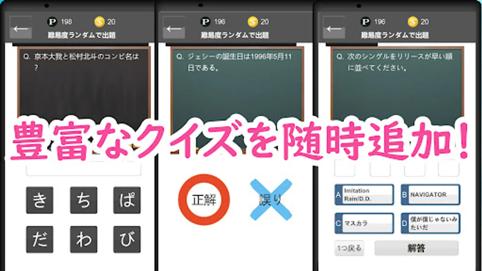 As for the quiz format, various types of quizzes such as "○ × quiz", "question-and-answer quiz", "sorting quiz", and "4 choice quiz" are randomly set, so you can enjoy it without getting tired.