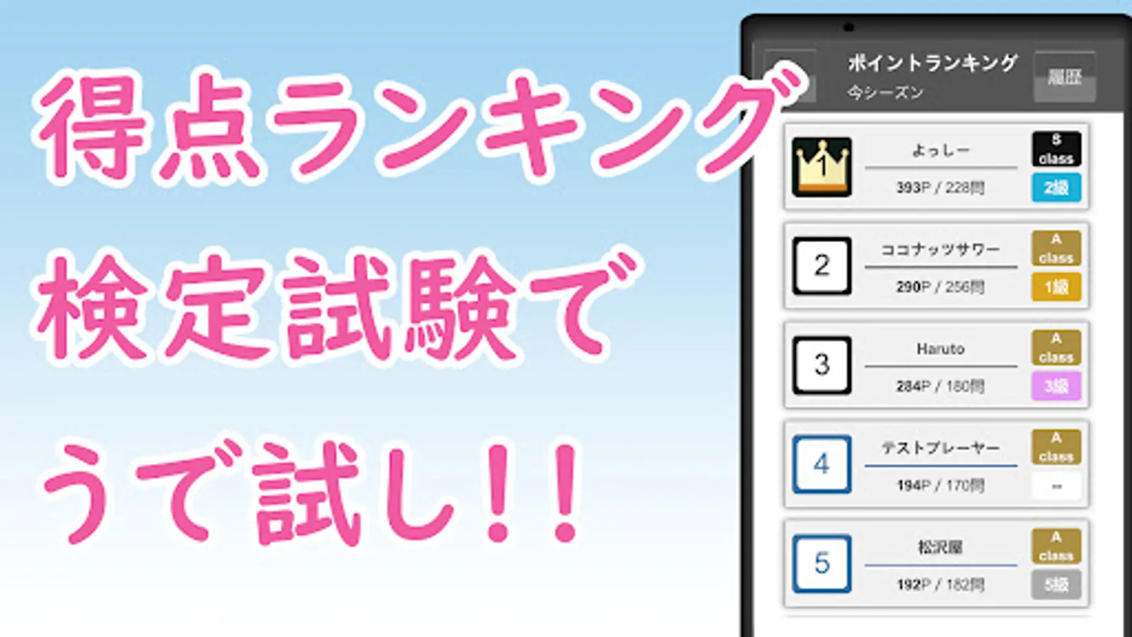 Players who can enjoy various ways such as earning points in free play and aiming for the title of "S class", completing up to the first grade in the test quiz, or creating an original quiz. It is a participatory quiz app. Just enter the player name and it will start quickly and you can stop it at any time, so it is ideal for killing a little time.