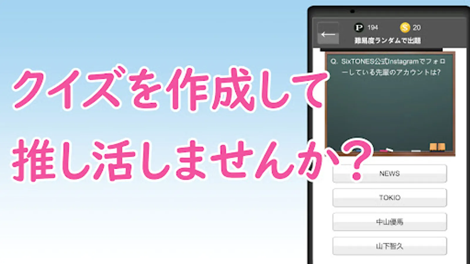 You can create an original 4-choice quiz (3 choices are also possible) from within this app. If you create a quiz, you will also get "medals" that can be used in the app, so we would appreciate it if you could share your knowledge.