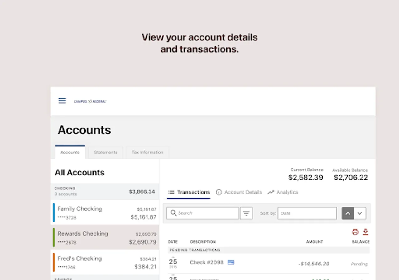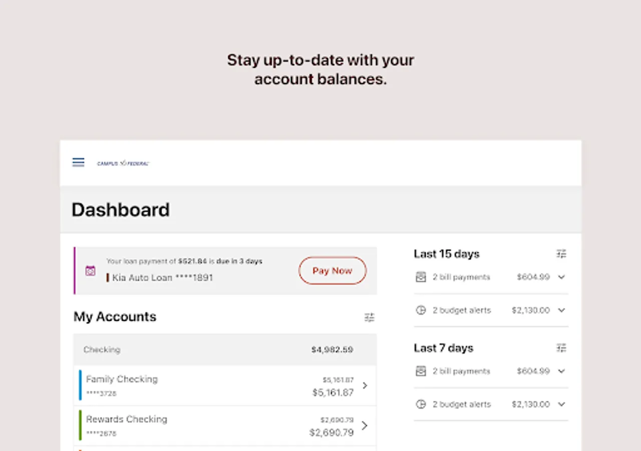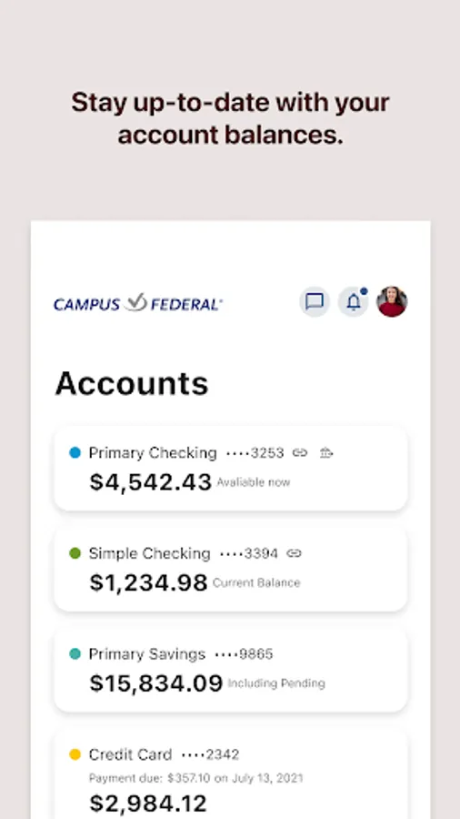 Campus Federal’s mobile app allows you to bank on the go, manage your money anytime, anywhere. With Campus Federal’s mobile app you can: