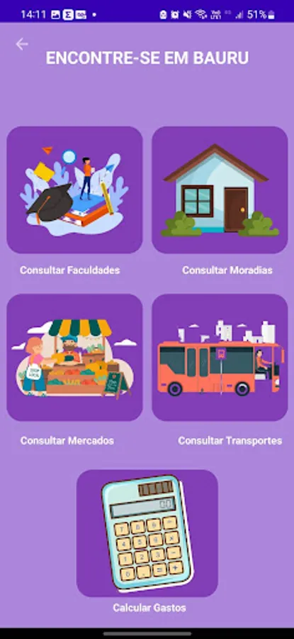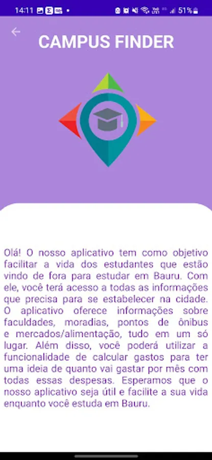 An application created with the purpose of helping future higher education students in decision making regarding various aspects that will impact their lives. Its objective is to help in the choice of university, housing, leisure and transportation, providing the advantage of verifying their respective values. Campus Finder's target audience is college students.