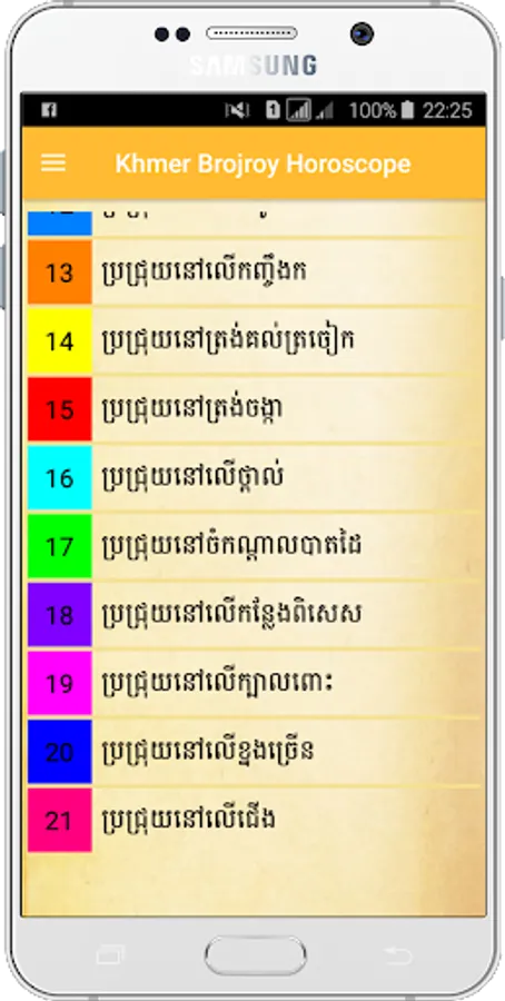 Khmer Brojroy Horoscope is a free and useful application. Brojroy on your face and body can tell you about your bad, good, destiny, and feeling. So please use it to find your meaning of Brojroy.