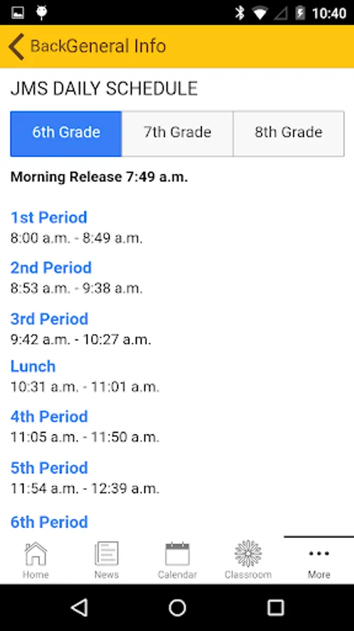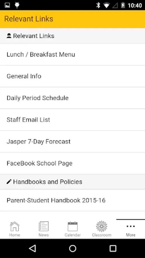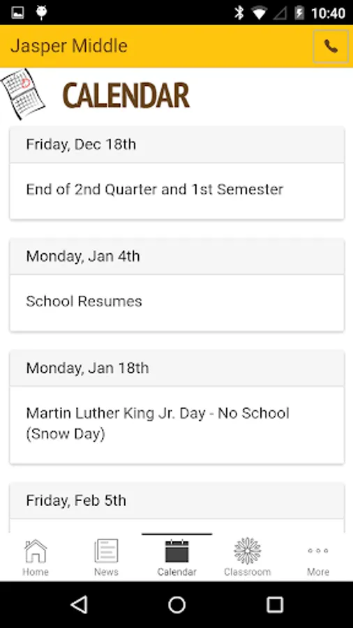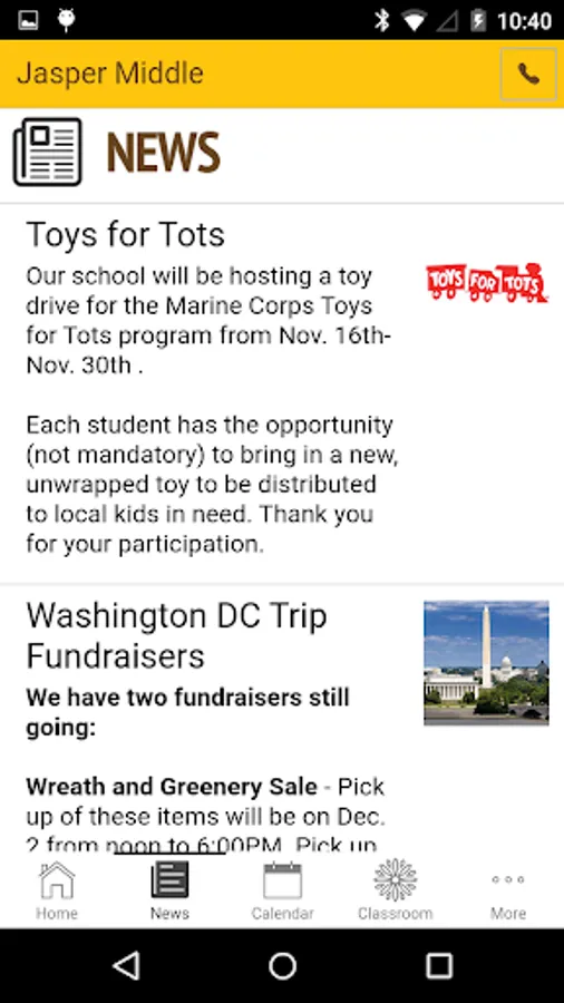 The Jasper Middle School app for Android allows student, faculty and parents to keep up to date with school and classroom communication. The app’s intuitive navigation provides quick access to the following: