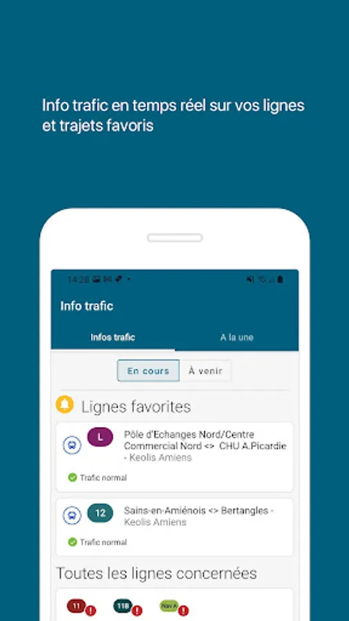 - the traffic info section: stay informed of the state of the traffic and personalize the traffic info by saving your lines as favorites