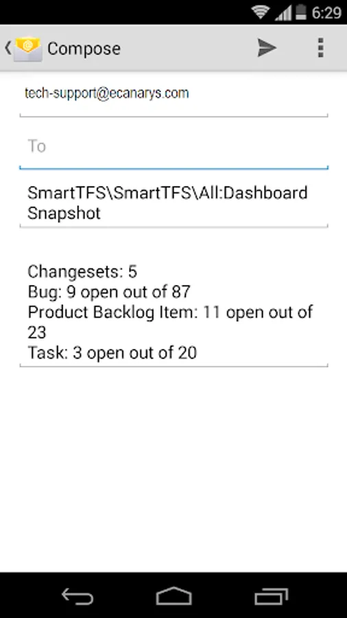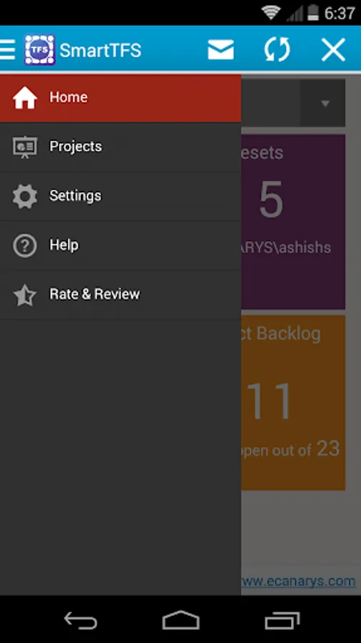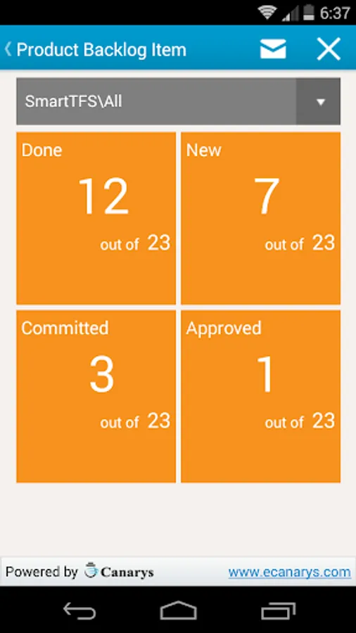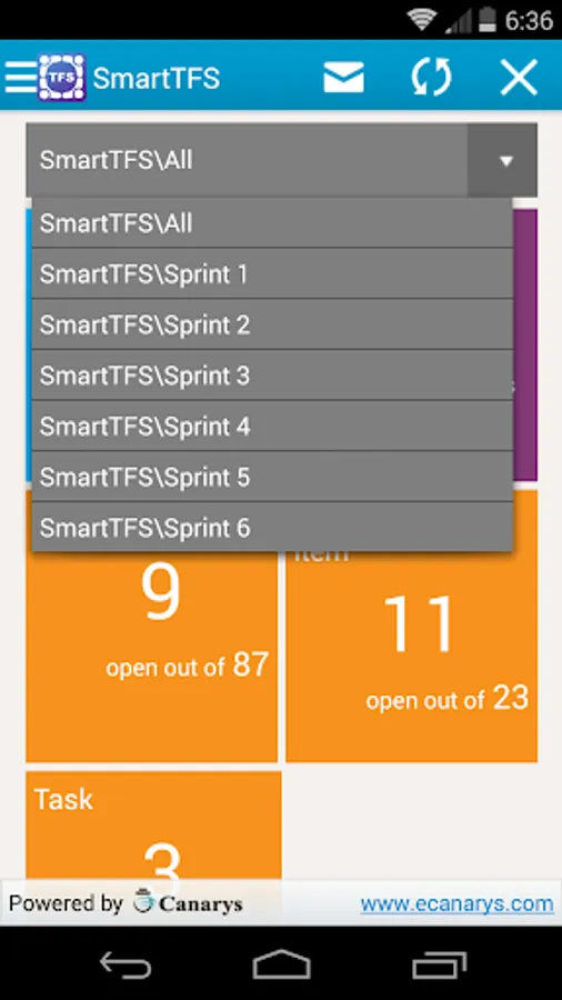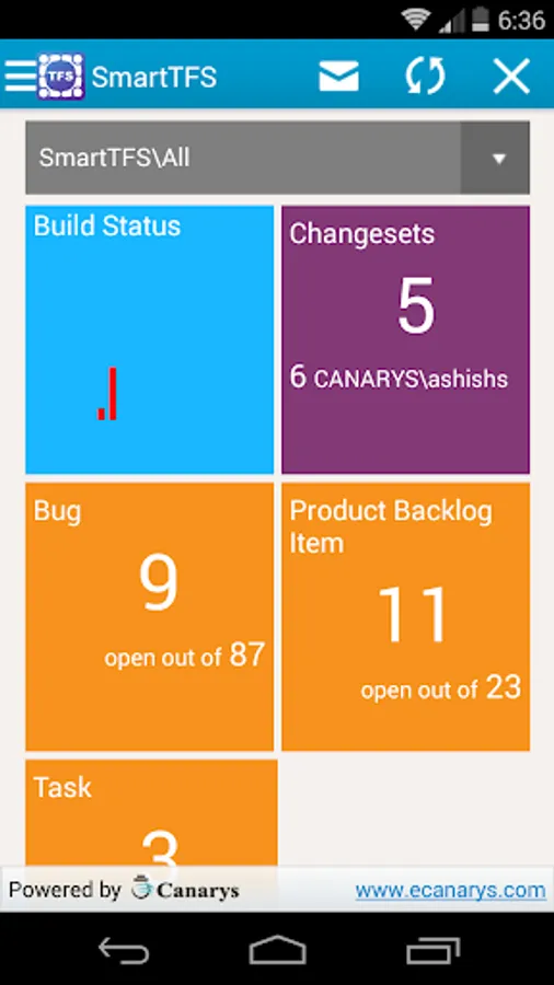 Authorized team members can quickly connect to their Team Projects over the OData Service from SmartTFS and track their project progress on the go. SmartTFS provides simple and intuitive layouts, easy navigation and drill-down data widgets to access the real time information on your Tasks, Requirements (Product Backlog Items), Bugs, Changesets, Tests, Features and Build Summary reports.