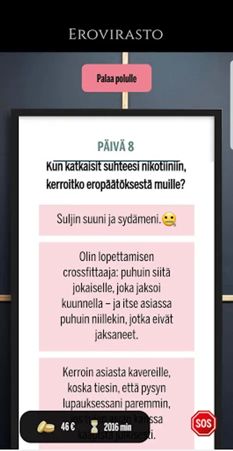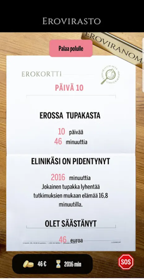 You will receive a variety of cheerful messages and information from the Divorce Authority on a daily basis to help you stay away from smoking or snus use. You can also keep track of how many euros you have saved when you are not using nicotine products and how the cessation affects your body from the Agency's counter.
