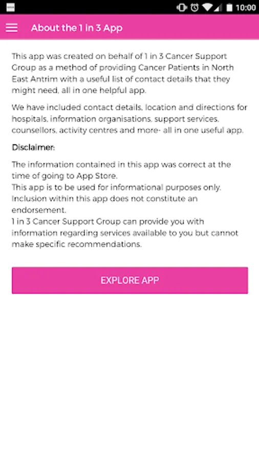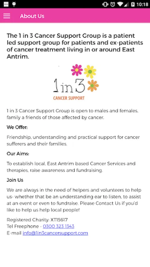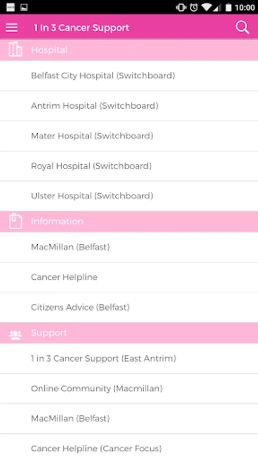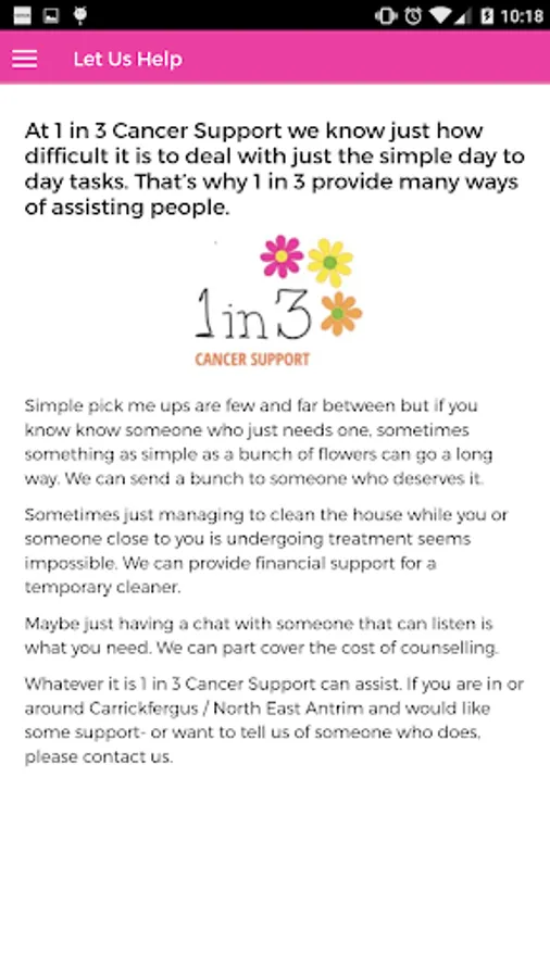 This app was created on behalf of 1 in 3 Cancer Support Group as a method of providing Cancer Patients in North East Antrim with a useful list of contact details that they might need, all in one helpful app.