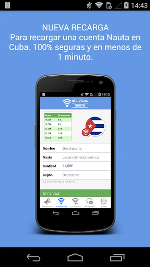 Your best choice for RECARGAS Internet NAUTA to recharge Cuba and sending SMS to Cuba is only in our app.
