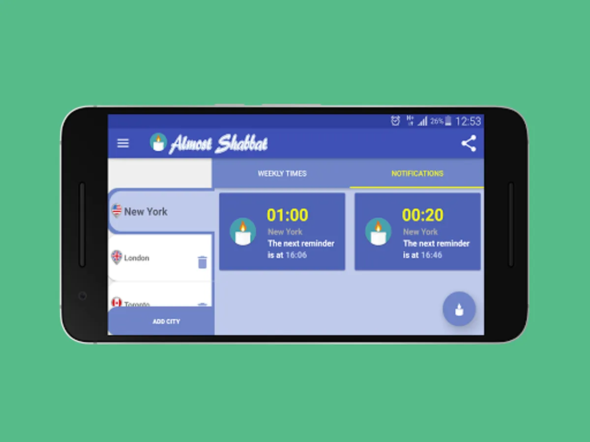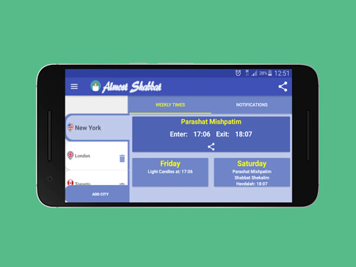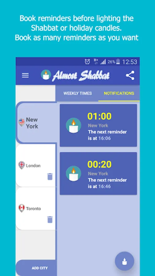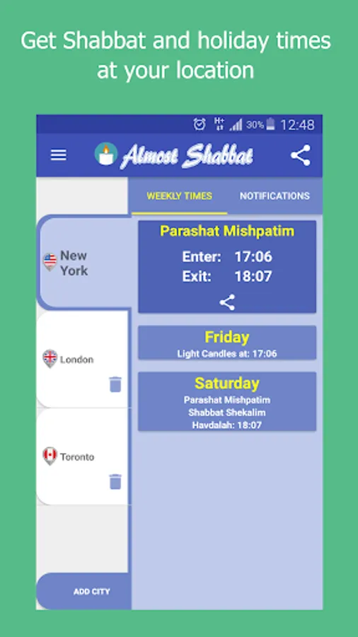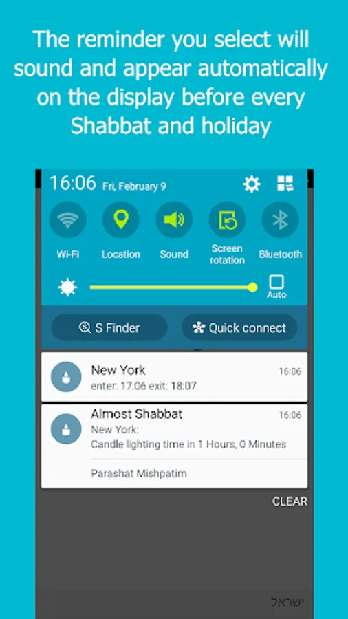 In addition, the application allows you to order thousands of Shabbat and holiday reminders and schedule them at different times, according to your location, or by hundreds of different cities in Israel and around the world.