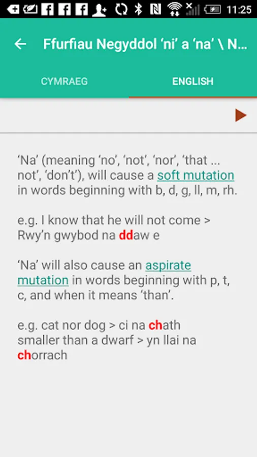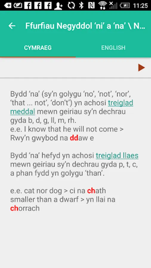 The aim of this app is to help Welsh speakers and learners to check mutations. The search element of the app only includes those words that will cause the immediate word that follows to mutate. Therefore, this element does not include every rule with regards to mutations. However, the revision element of the app is more comprehensive, and it is aimed as a tool to aid revision of the mutation rules.