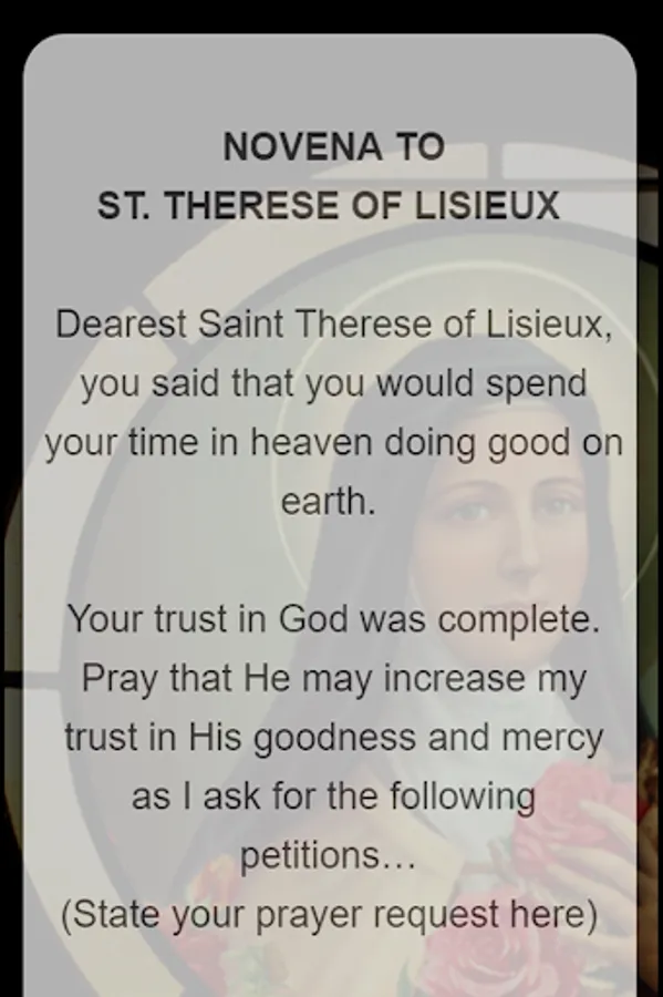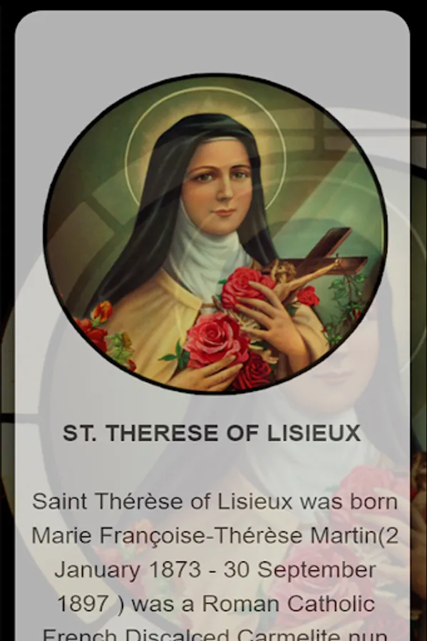 In our humble app, you will find information on St. Therese of Lisieux, including a short life biography, St. Therese feast day, St. Therese novena prayers and St. Therese powerful Catholic prayers.