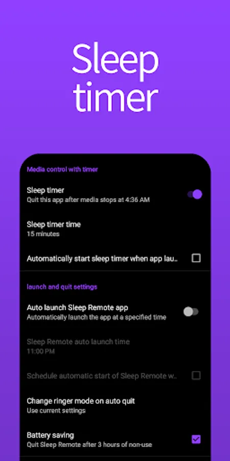 Sleep timer - With the sleep timer, when the timer expires after the specified time, the media stops playing and exits the app.