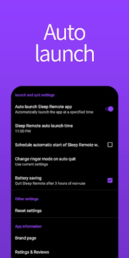 Auto Launch - Launches the app automatically at a specified time. (You can turn off the music and sleep comfortably by running the app at the desired time every day and operating the sleep schedule timer.)