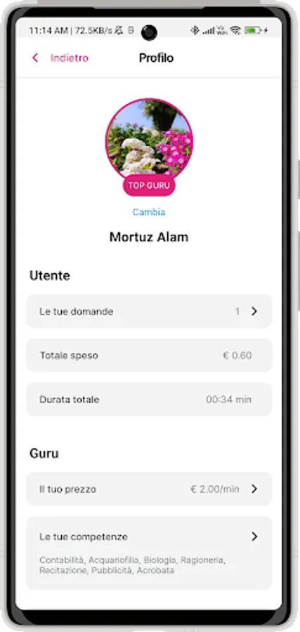 Ogni Guru avrà un punteggio di qualità dato dalle recensioni ottenute ed un prezzo da lui indicato per ogni minuto di conversazione.