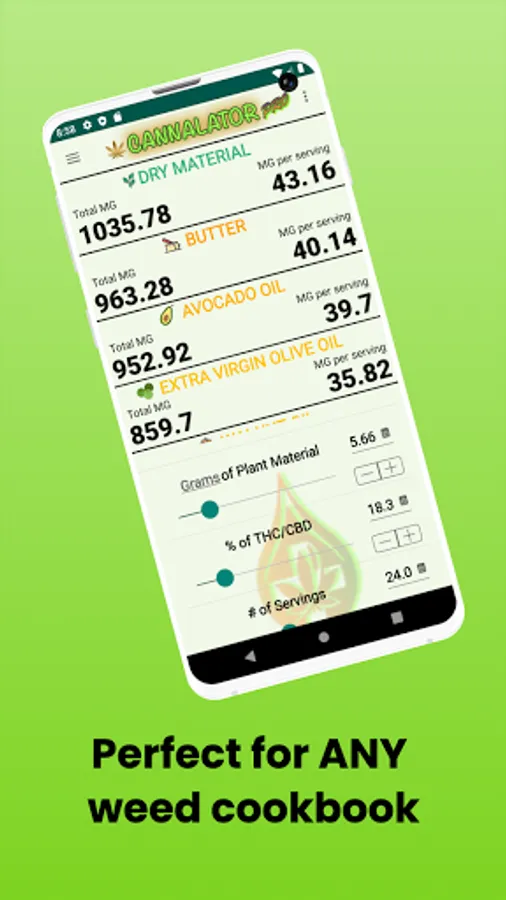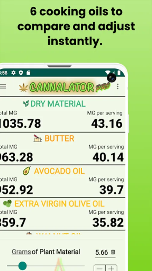 Stop guessing and upgrade to Cannalator Pro! There are options available to help you even more. Cannalator Pro comes with a decarboxylation converter and six different cooking elements. Each element with its infusion percentage is displayed for you to compare.