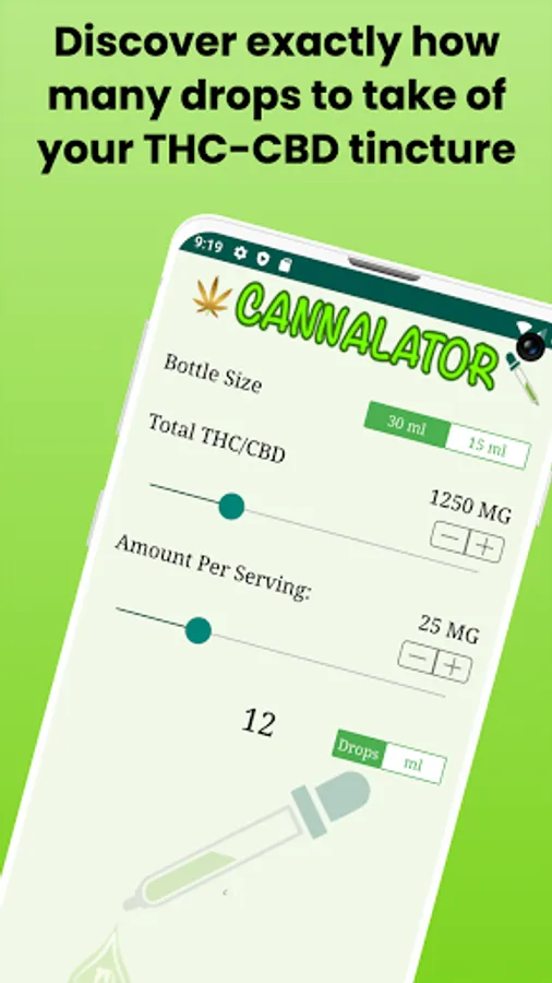 Cannalator also comes with a tincture drop counter, perfect for any CBD oil. Two options are available for vial sizes, 30 ml, and 15 ml. Enter the total amount of CBD or THC, along with your desired amount per serving, and Cannalator will tell you exactly how many drops to take!