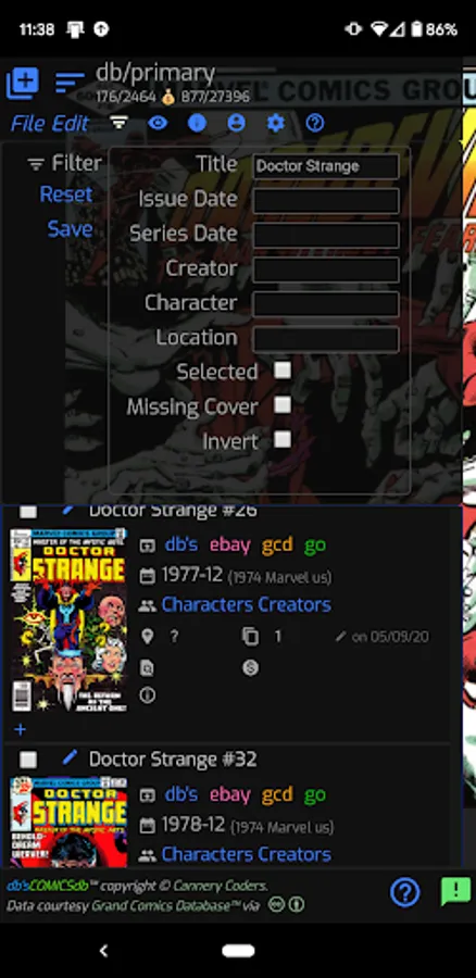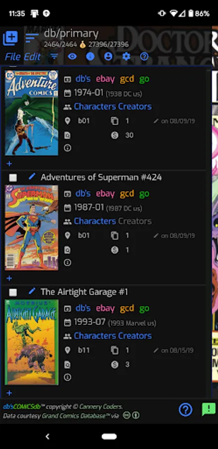 To build your own database, add comics by entering Series and Issues. Now you can search through comics by creator, character and date. You can also provide details about each of your comic's condition, location and valuation and even add custom cover scans or photos. Convenient links to online resources like ebay and GCD allow you to update and monitor your collection.