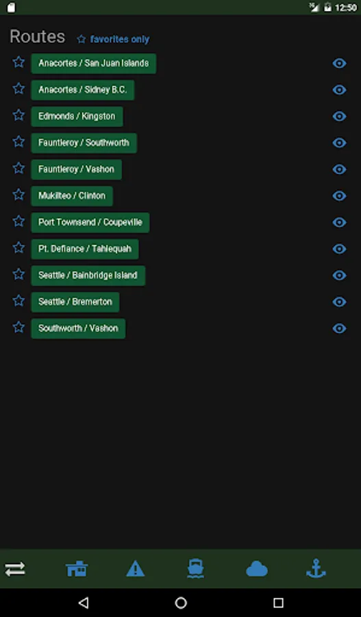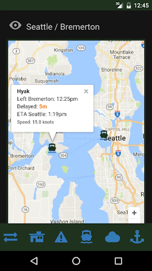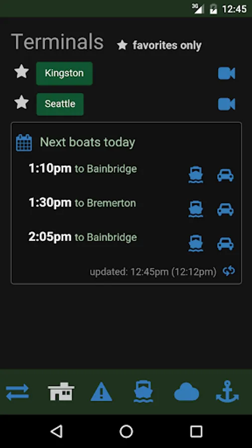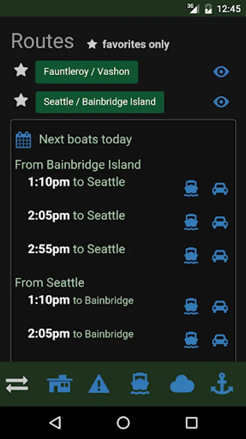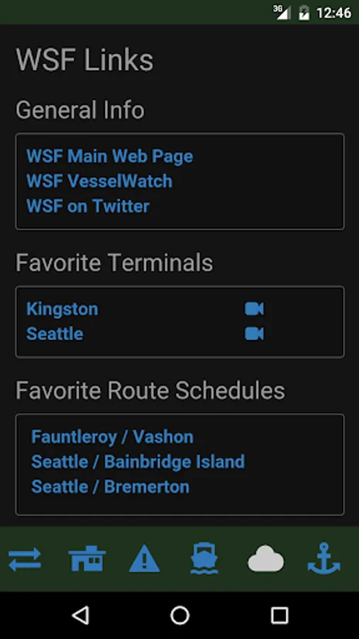 nextboat sports a homescreen widget and seven different views into the Washington State Ferry (WSF) system to accomplish a number of tasks: