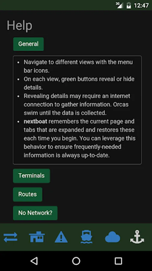 nextboat relies upon internet access to WSF servers to obtain up-to-date status information. We employ caching strategies to improve responsiveness and reliability, but capabilities are impaired when internet access is unavailable.