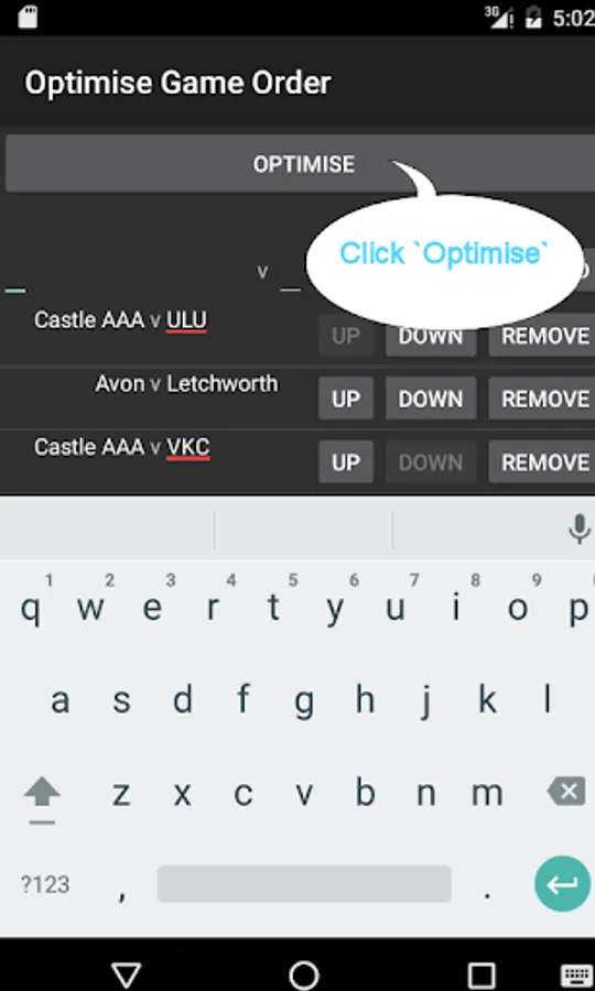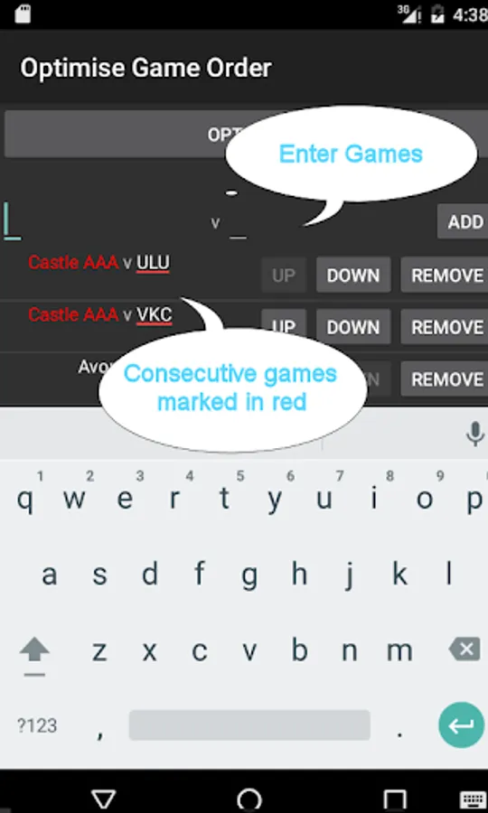 Given a list of matches, the program will optimising the game order, so that teams do not play back to back games if at all possible, and so that teams don't have to wait too long imbetween games.
