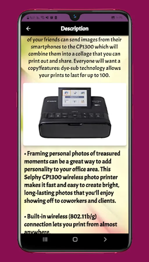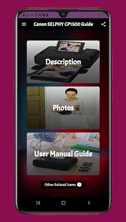 In Canon SELPHY CP1300 Guide app we supported many sections of content that will let you now more information about Canon SELPHY CP1300 Guide