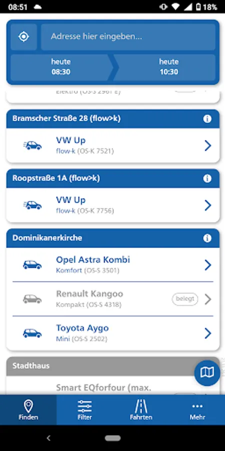 Cross-usage makes it possible to book vehicles from our car-sharing partner organizations in many German cities. Available vehicles can be found clearly on the map in the app.