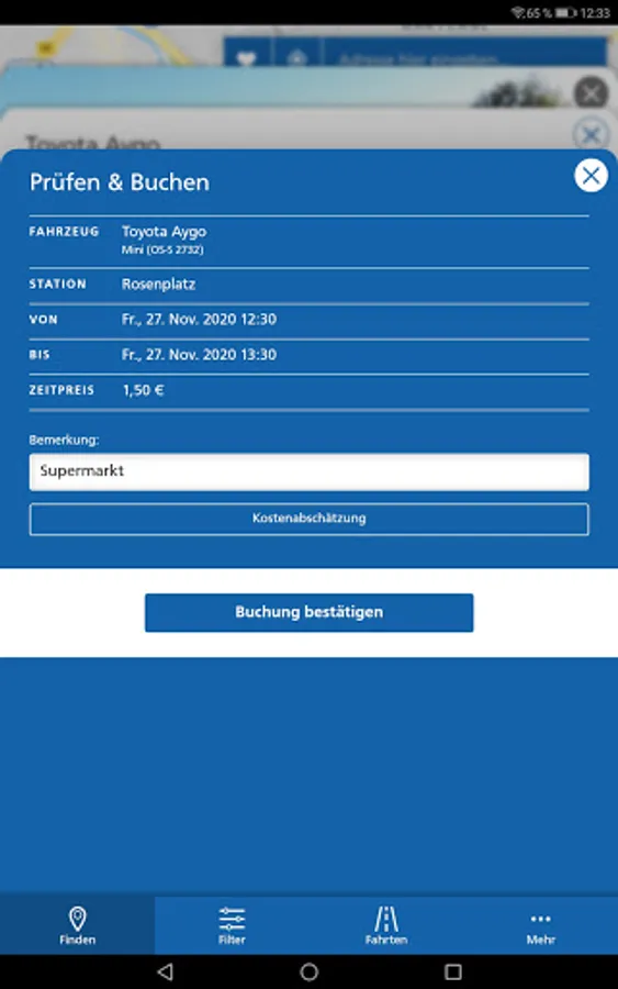 Before booking a vehicle, you can determine the estimated travel costs using the "cost estimate". Please enter the planned distance in km after the time selection.