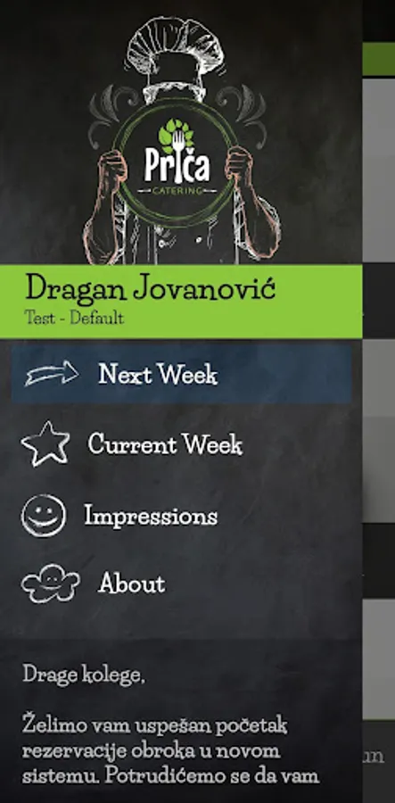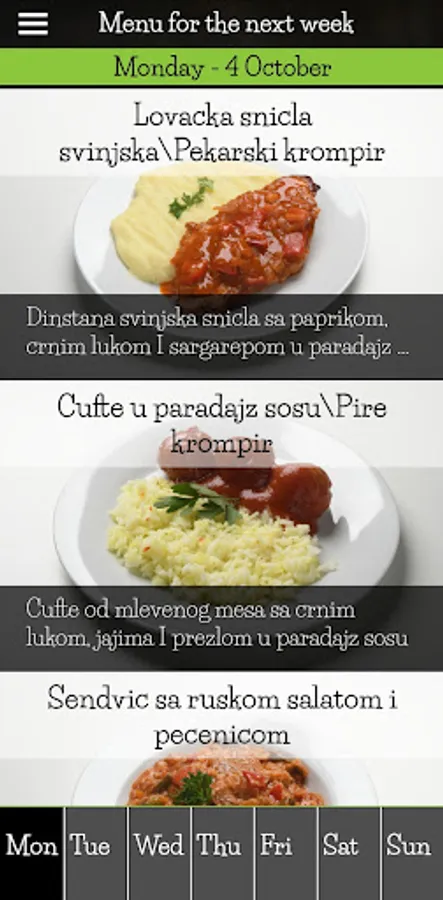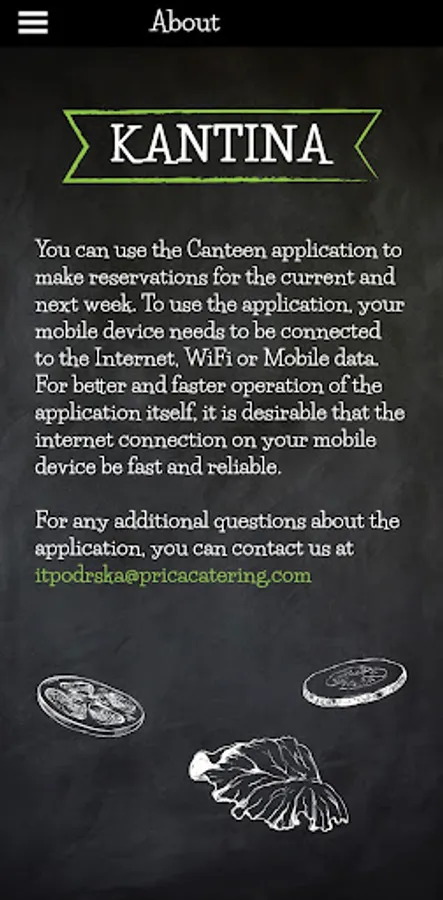 You can use the Kantina application to make meal reservations for the current and next week. To use the application, your mobile device needs to be connected to the Internet, WiFi or Mobile data. For better and faster operation of the application itself, it is desirable that the internet connection on your mobile device be fast and reliable