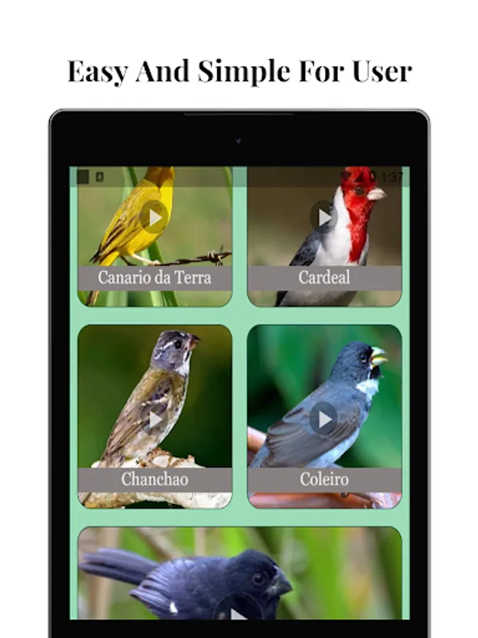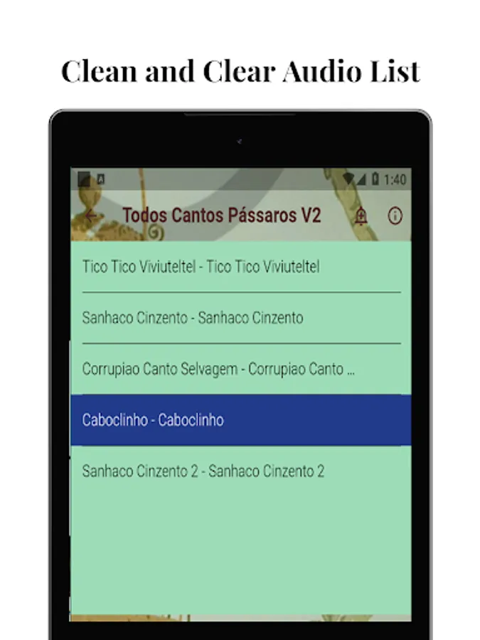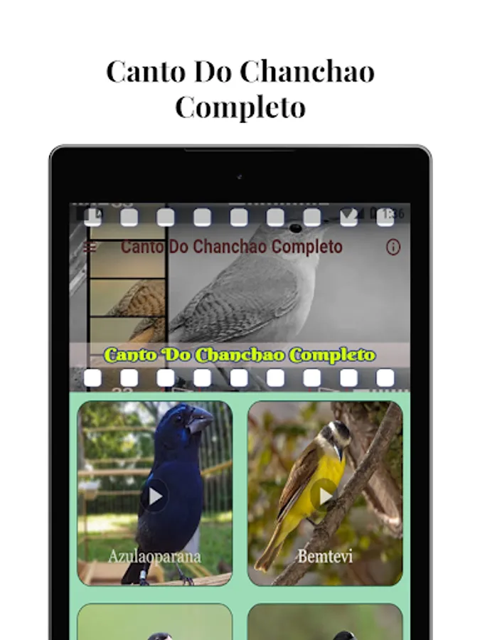 It brings the various songs of the most famous birds in Brazil, among them we have the Curió, Trinca Ferro, Coleiro, Canário da Terra, Canário Belga, etc.