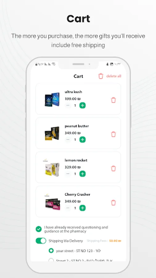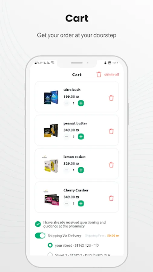 Through the app, users can upload their prescription, choose desired cannabis strains according to the prescription, select the desired dosage, and choose a pharmacy for pickup or delivery of the cannabis. The application also offers payment options and order tracking to provide users with a convenient and personalized shopping experience.