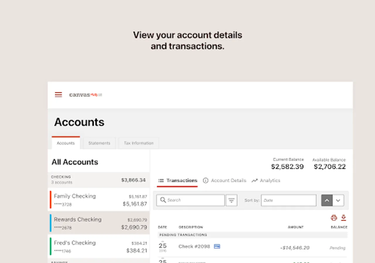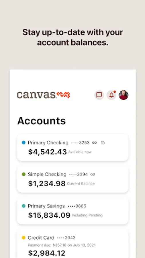 The Canvas app lets you bank on the go so you can stay focused on the moment. Easily check account balances, deposit checks, track spending, apply for loans, and so much more. With the Canvas app, the banking tools you need to afford life are in the palm of your hand.