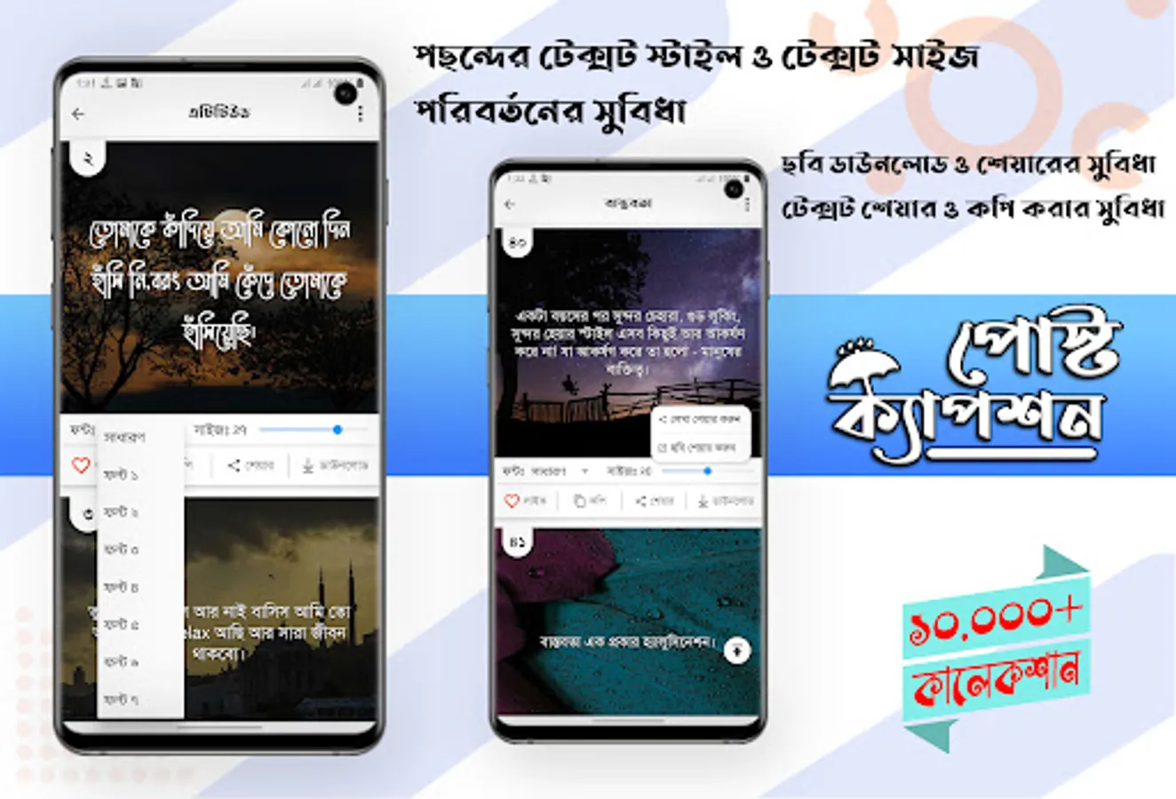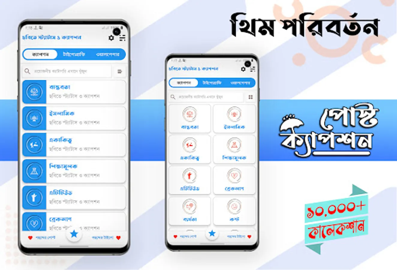বাংলা স্ট্যাটাস ও ক্যপশন পোস্ট এর মাধ্যমে আমরা চেষ্টা করেছি বর্তমান সময়ের বাছাই করা স্ট্যাটাস ক্যাপশন সমূহ থেকে ভাইরাল স্ট্যাটাস ক্যাপশন নিয়ে বাংলা সেরা স্ট্যাটাস ও বাংলা সেরা ক্যপশন এবং উক্তি গুলো আপনার কাছে পৌঁছে দিতে। ক্যাপশন স্ট্যাটাস এ রোমান্টিক সাইরি, ভালোবাসার সেরা বাণী, প্রবাদ বাক্য শিক্ষামূলক ও প্রেরণামূলক উক্তি (bikkhato ukti), বাংলা বেস্ট ফানি স্ট্যাটাস রয়েছে। বর্তমান সময়ে বেশিরভাগ মানুষ সামাজিক মাধ্যমেই বিভিন্ন বিষয় নিয়ে নিজের মনোভাব তুলে ধরার চেষ্টা করে, তাই যারা বিভিন্ন বিষয়ের ভাইরাল স্ট্যাটাস ক্যাপশন, উক্তি, ছন্দ এবং বিনোদনের জন্য ভাইরাল ফানি ফেসবুক পোস্ট ইত্যাদি খোঁজ করছেন তাদের জন্য খুব সহজ ও ব্যাবহার যোগ্যকরে তৈরি করেছি। বাংলা সেরা ফেসবুক স্ট্যাটাস ও বাংলা সেরা ক্যাপশন সহ স্মার্ট ফেসবুক স্ট্যাটাস, ইমোশনাল স্ট্যাটাস ও বিখ্যাত ব্যক্তিদের বিখ্যাত উক্তি তুলে ধরা হয়েছে যা, bangla popular status for fb. বাংলা নিউ স্ট্যাটাস - বেস্ট ক্যাপশন বাংলা বন্ধুদের সাথে শেয়ার করুন। ফটো ক্যাপশন 2023 কভার ও প্রোফাইল পিকচার হিসাবে ফেসবুকে পোস্ট করুন। ইসলামিক শিক্ষামূলক উক্তি,(quotes for love)ভালোবাসার ও রোমান্টিক স্ট্যাটাস দিয়ে আপনার মনের ভাব প্রকাশ করুন। বাংলা স্ট্যাটাস ও ক্যাপশন অ্যাপটিতে থাকা ফেসবুক পোস্ট স্ট্যাটাস এর মাধ্যমে নতুন ফানি স্ট্যাটাস কালেকশনগুলো সোশ্যাল মিডিয়ায় আপনার গুরুত্ব আরো বারিয়ে দিবে।
