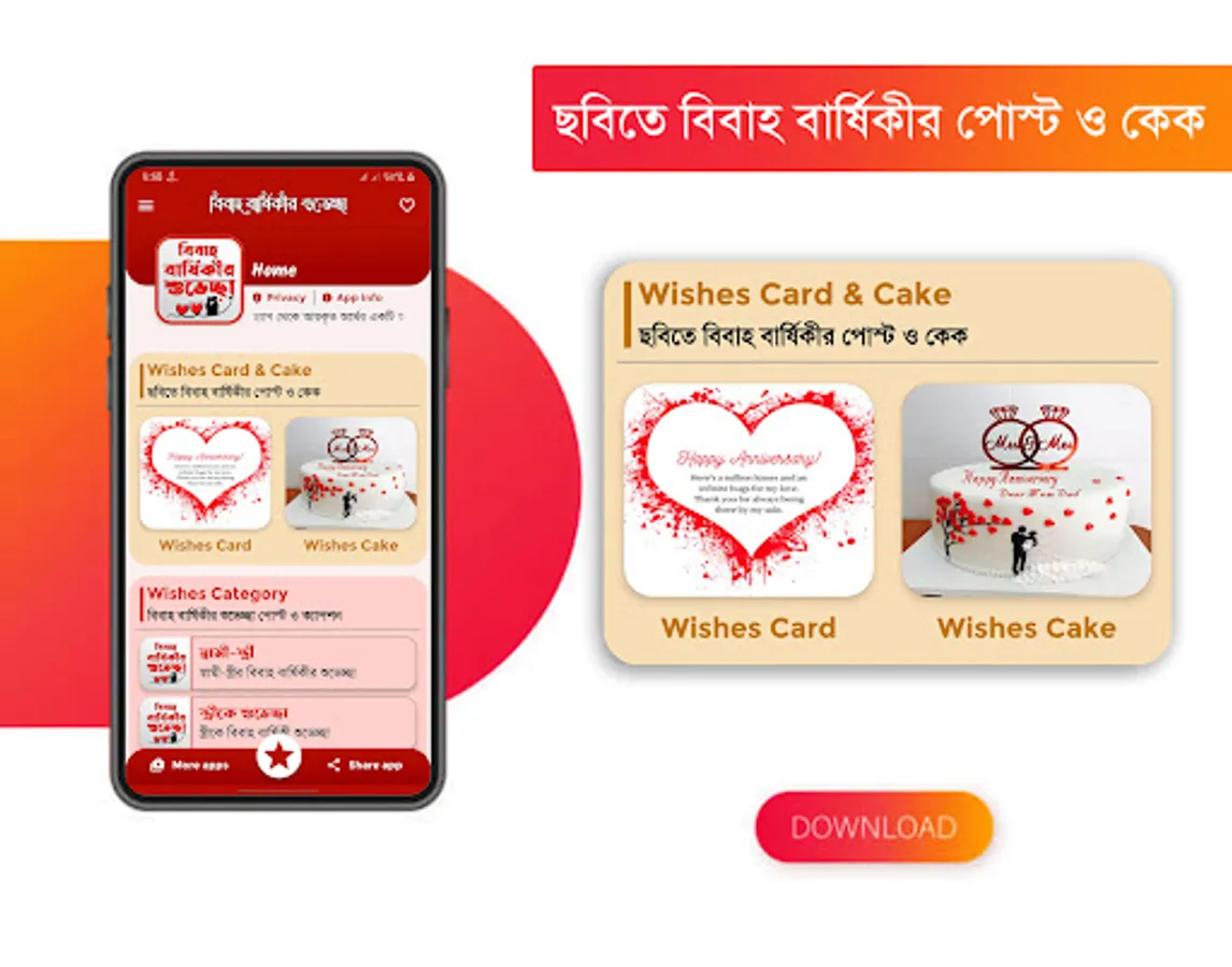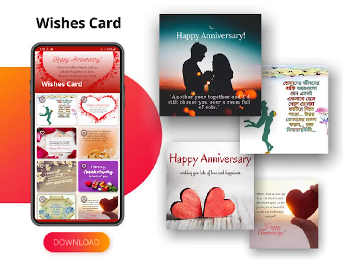 "Anniversary Wishes - Celebrate Love & Togetherness" is the perfect app to make your loved one's marriage anniversary extra special. With a vast collection of heartfelt and personalized wishes, this app offers a convenient way to express your love and appreciation. Whether you're searching for a romantic message or Marriage anniversary status bangla, Anniversary Wishes has it all. Choose from various categories, customize your message, and share it directly from the app via social media or messaging platforms. Surprise your partner, friends, or family members with beautiful anniversary wishes that will warm their hearts and make their special day unforgettable. Download Anniversary Wishes now and spread the joy of love and togetherness on this cherished occasion.