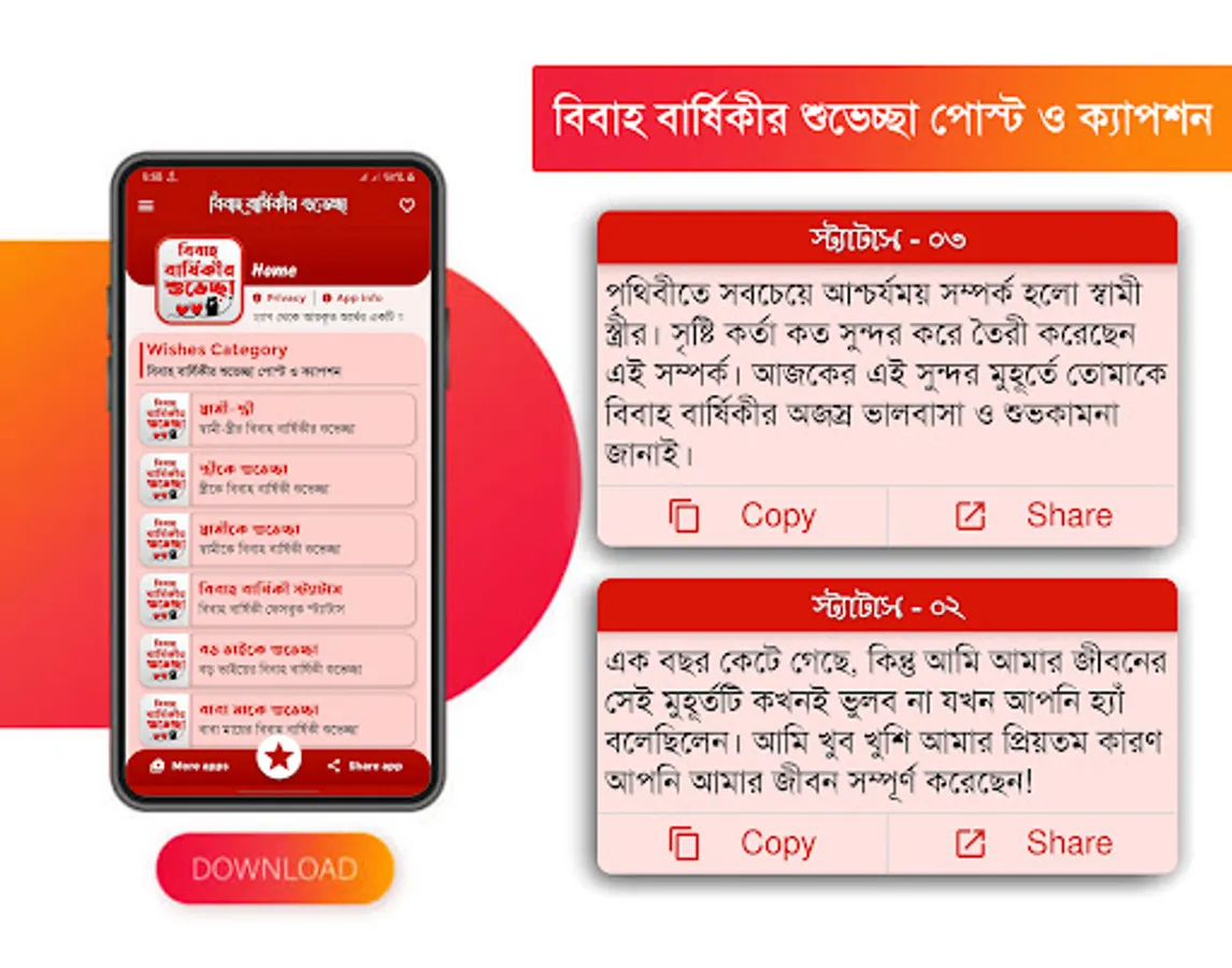 এখানে আমরা সুন্দর সুন্দর অনেক গুলো স্ট্যাটাস ও বাংলা এসএমএস দিয়েছি। এগুলো আপনার স্ত্রীকে বা প্রেমিকা কে খুশি করার জন্য শেয়ার বা সেন্ড করতে পারেন। আমাদের এই বাংলা মেসেজ সফটওয়্যার থেকে Bibaho barshiki status or Bibaho barshiki sms bangla গুলো নিয়ে যাকে উদ্দেশ্য করে ফেসবুক স্ট্যাটাস পোস্ট করবেন সে নিশ্চয়ই লাইক করবে। তাই আমরা এখানে আরো কিছু নিজের বিবাহ বার্ষিকী ফেসবুক স্ট্যাটাস পোস্ট তুলেছি। কারণ এগুলো খুবই রোমান্টিক এবং ভালোবাসার এসএমএস 2023। তাহলে এখনি ইনস্টল করে দেখে নিন স্ট্যাটাস অ্যাপ টি।