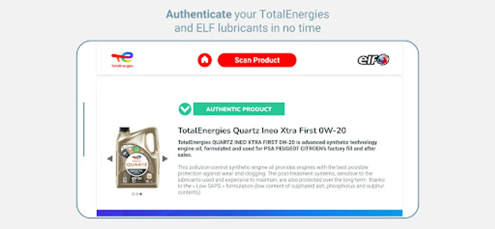 Scan TotalEnergies (formerly TotalEnergies ACF mobile app) allows you to authenticate any TotalEnergies lubricant product.