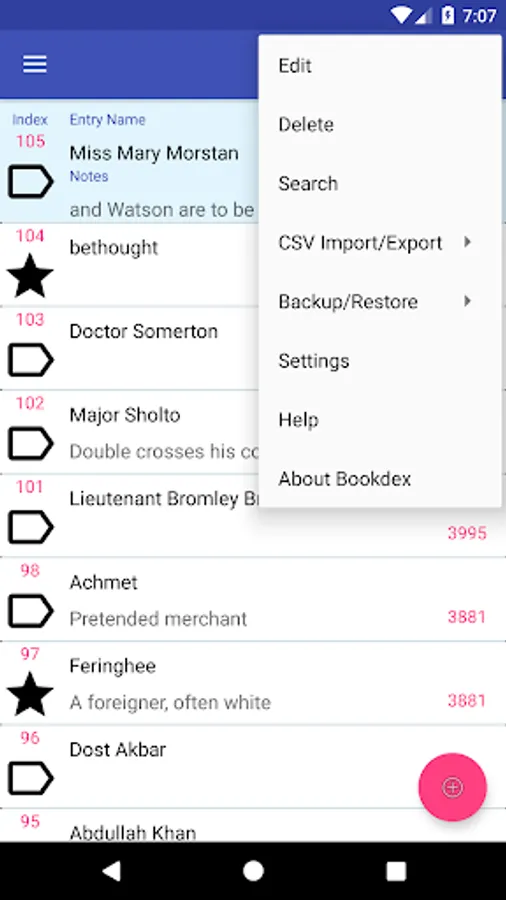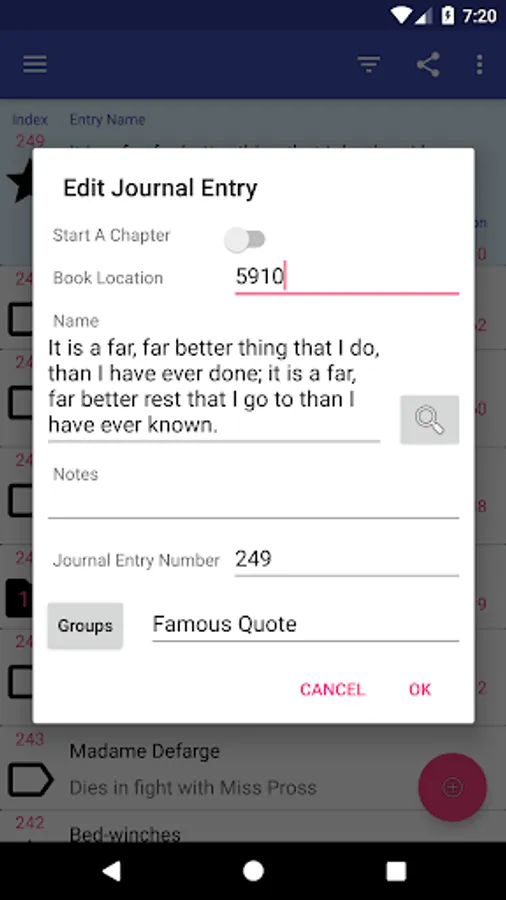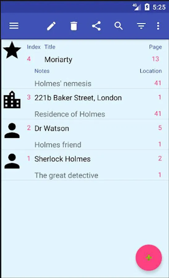 Start a Bookdex journal and organize information into groups such as places, events, or characters. You can create your own groups so it’s very flexible. You can search your Bookdex journal or filter for example by name or groups; you can share your journal; and you can export it to a spreadsheet or to Bookdex-Pro.