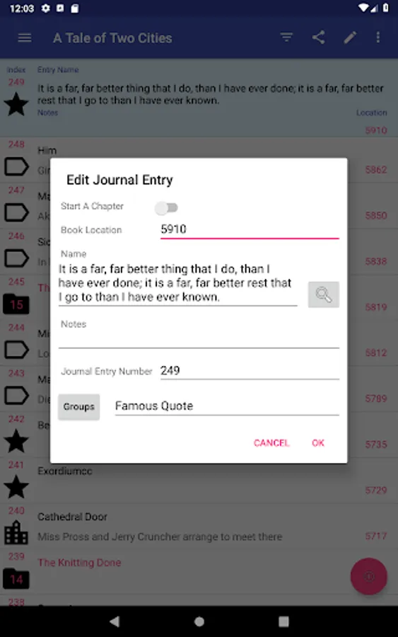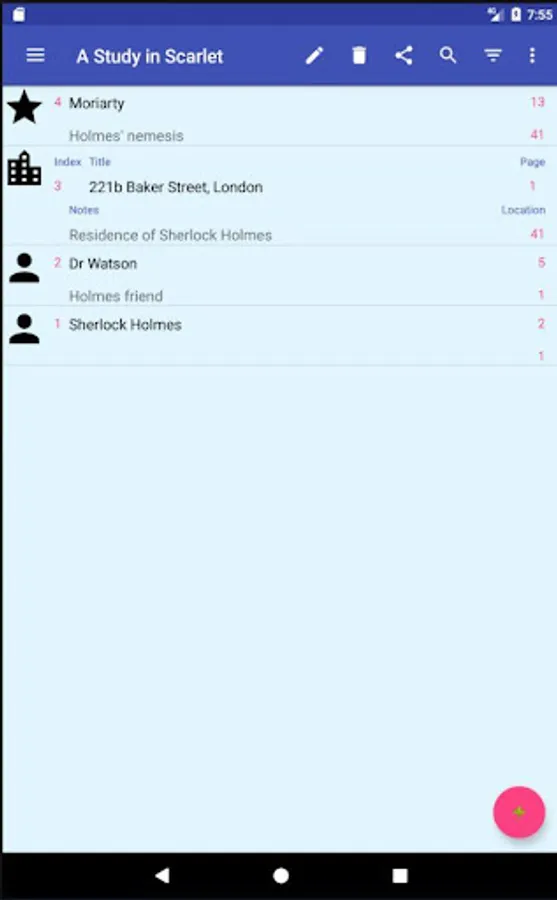 Start a journal and organize information into groups such as places, event, or characters. You can create your own groups so it’s very flexible. You can search your journal or filter for example by name or groups; you can share your journal; and you can export it to a spreadsheet or another Bookdex-Pro.