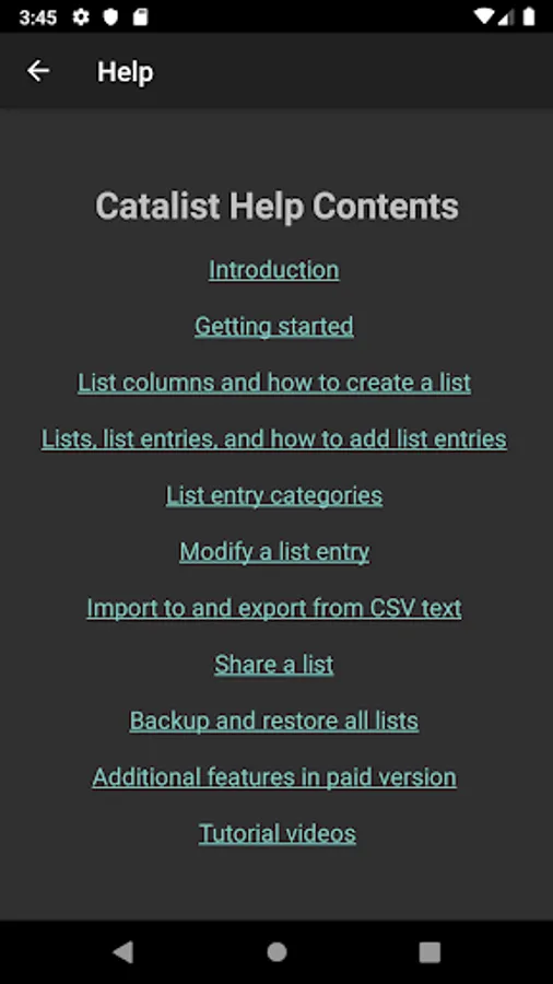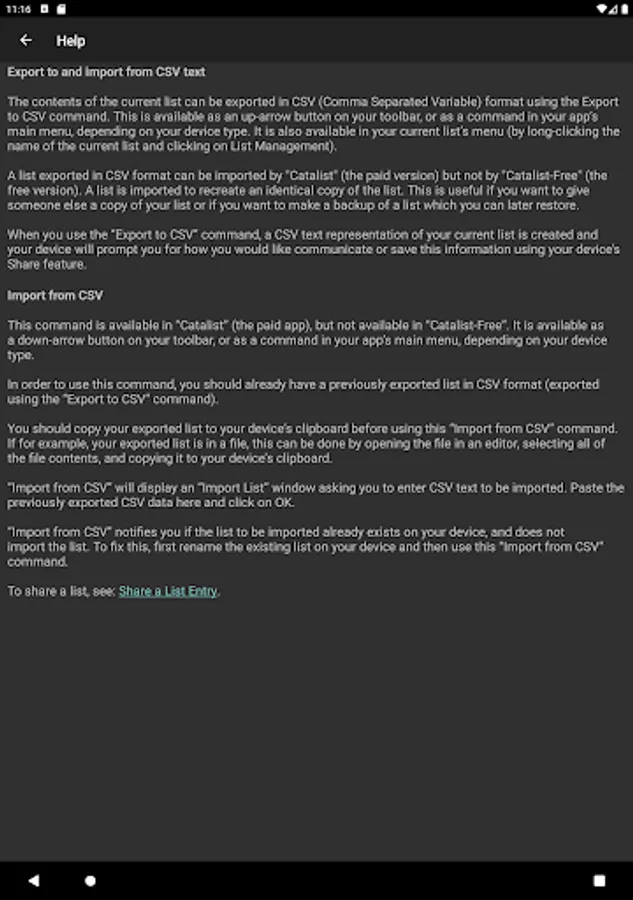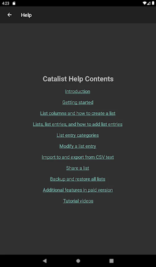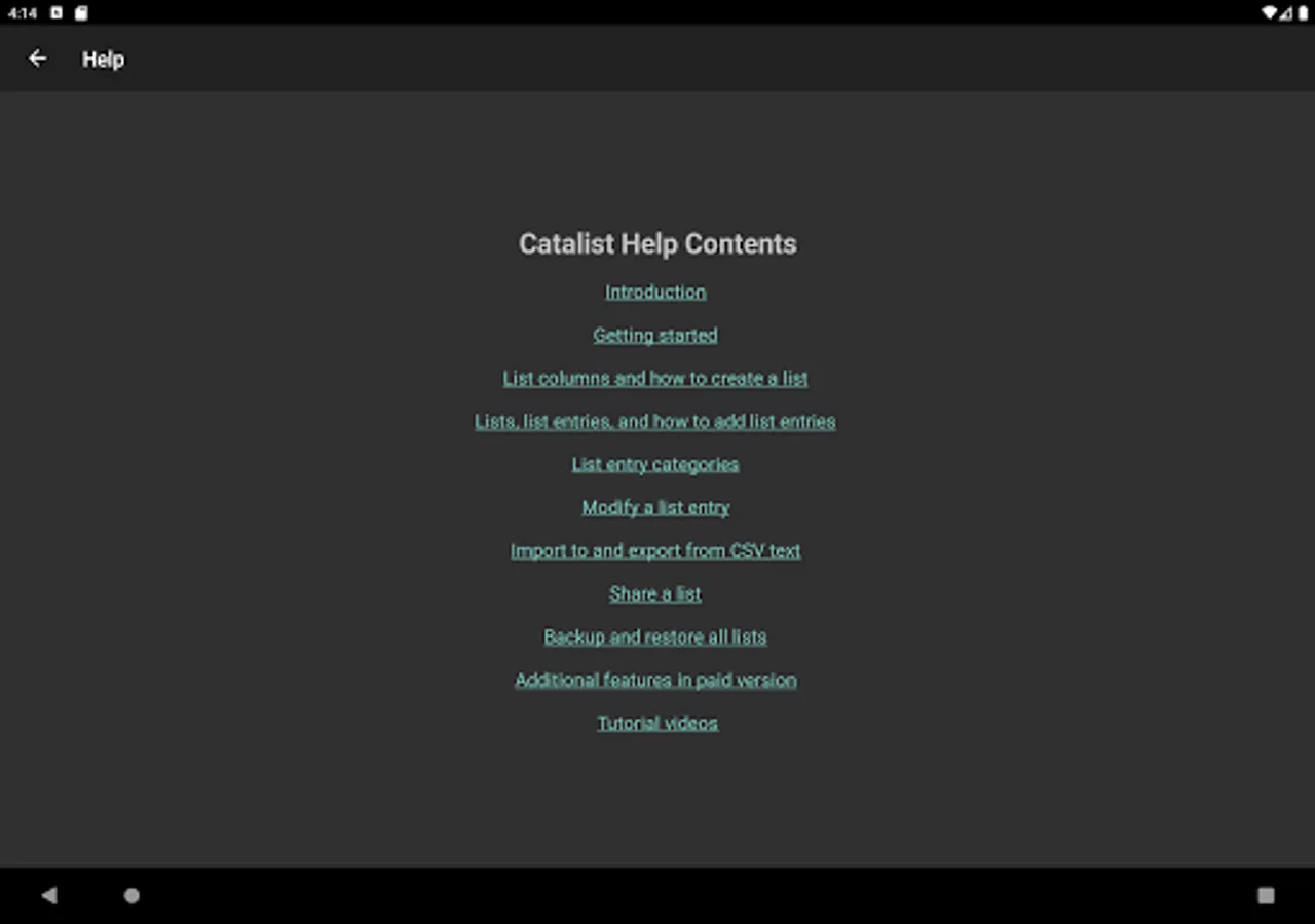 The help pages describe how to use Catalist, which includes information on advanced features such as copying and renaming your lists. There are also tutorial videos.