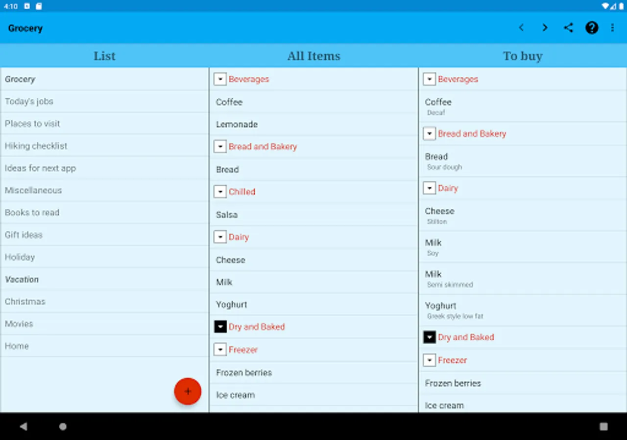 A Catalist list has multiple columns. You can swipe list entries between columns. For vacation planning, this could be one column for things you need to do, and a second for things you have done. For a reusable shopping list, this could be one column containing all possible things you might buy, a second column for things you intend to buy, and a third for those in your shopping basket. Just swipe the entries between the columns.
